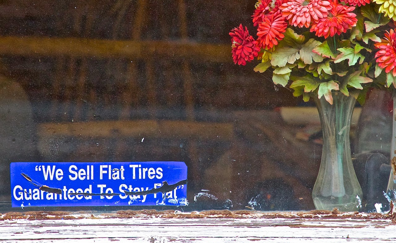 Side note: You wonder, who would sell flat tires? Well, a local artisan wants your old grungy, tubular discards so he can recycle them into functional floor mats and last-forever flower pots.