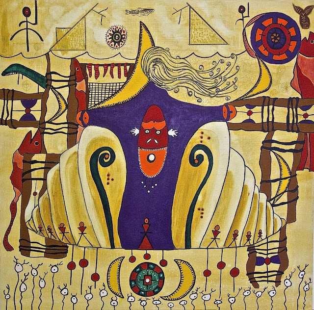 The idea for this painting originated in Italy; after observing a tiled, stylized cross in a church, the shape reminded me of Native American capes that people wear at village dances and potlatches. I am deep in the process of writing a fiction project about a Yup’ik boy who comes of age while enduring the hardship of his best friend’s suicide, in combination with his love for a visiting teacher who is, at best, cavalier with his feelings. Post high school, he travels to New Mexico to attend art school, and to his astonishment, realizes an expanded and compelling worldview. He finds, through sculpture and painting, the beginnings of renewed hope and healing; a newly fabricated sense of self and over-arching purpose that guides his future actions. In the end, he marries a woman from his village home, fathers a baby (with fetal alcohol syndrome), and carves out a life, fraught with pain and difficulty, though deeply lived with appreciation and great love.