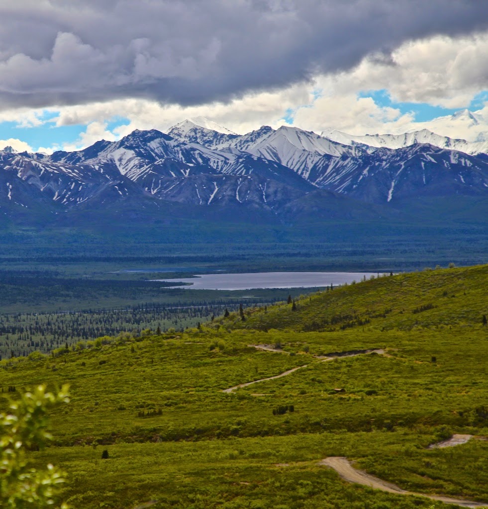 From the top of Belanger Pass, we hopped off our wheelers, and spinning slowly in place we took in the view of 4 different mountain ranges: the Alaska Range, the Talkeetna Range, the Wrangell-St. Elias Range and the familiar, in our backyard Chugach Mountain Range.