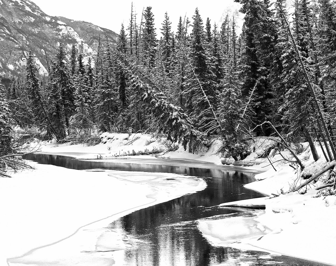 No matter how you parse it, I live in a world of black and white a great deal of the time, during the winter season. When the sun doesn’t shine, color has sailed on a ship so far out at sea you wonder if you’ll ever see bloom and petal again. No trick of the camera, no photo editing. Grays and whites and blacks…even the trees aren’t green when the sun doesn’t shine…maybe that’s precisely why they’re called “black spruce.”