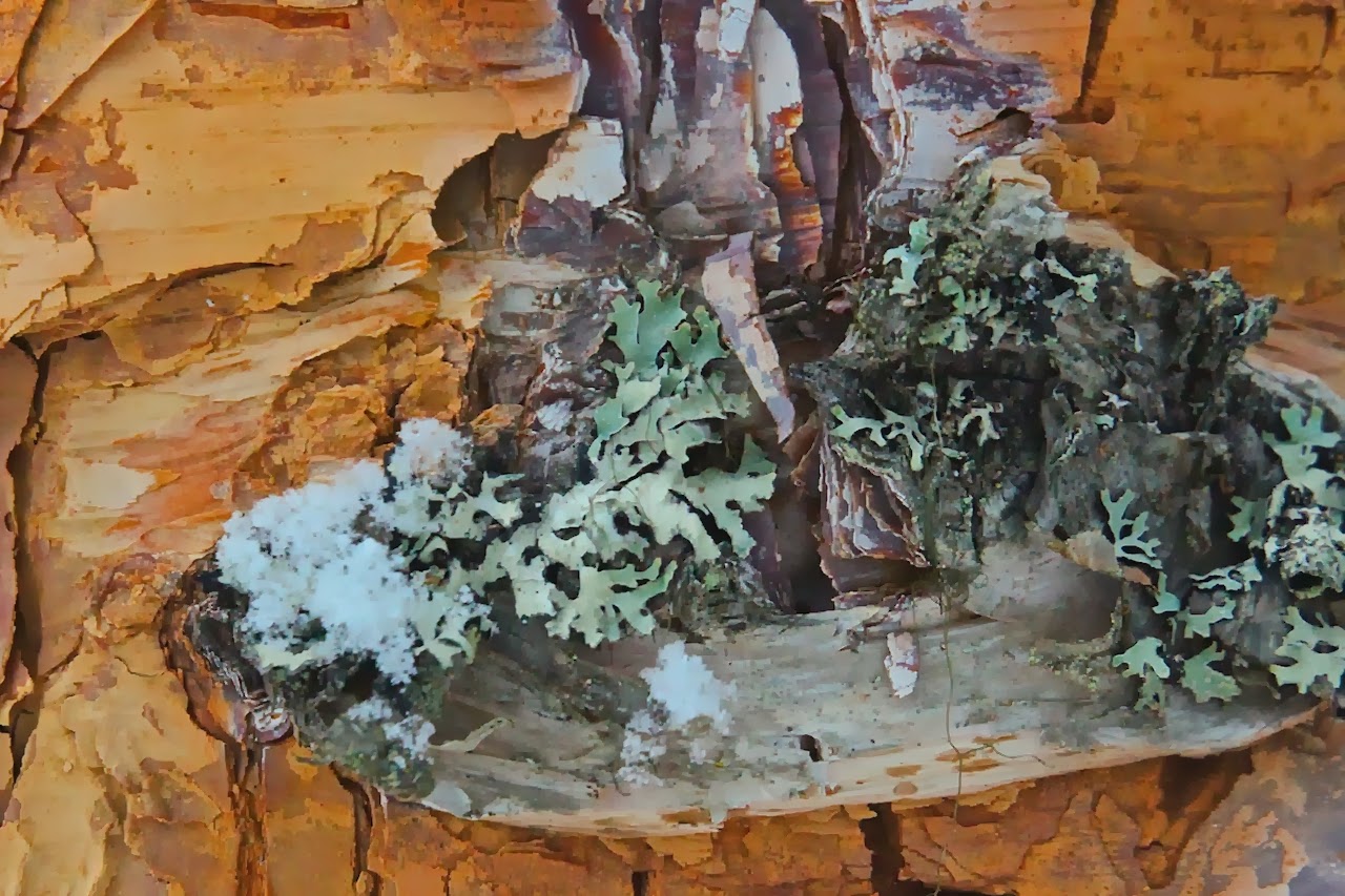 With nose to tree trunk (no worries; I was alone in the woods, no one to watch me rubbing noses with birch bark), I perused some more. When I patiently looked a little harder, paid deeper attention to the subtle layers, I found a little green garden within a patch of bark that looked so cute I wouldn’t mind moving in someday. GREEN! OMG!