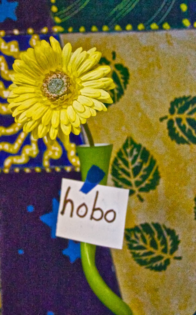 I stayed out of his space, and attached my words to common objects around our home, and suddenly it seemed as though the label, in a small albeit interesting way, changed the way I viewed the object. New connections were born; fresh metaphors came to mind. I actually felt a little compassion for those tomatoes (soon to be eaten or rotted); saw my guitar as a Star Child, or the center of my universe (which she most certainly is), and felt the whimsy of a hobo, a solo flower child perhaps? kicking the leaves as she walked.